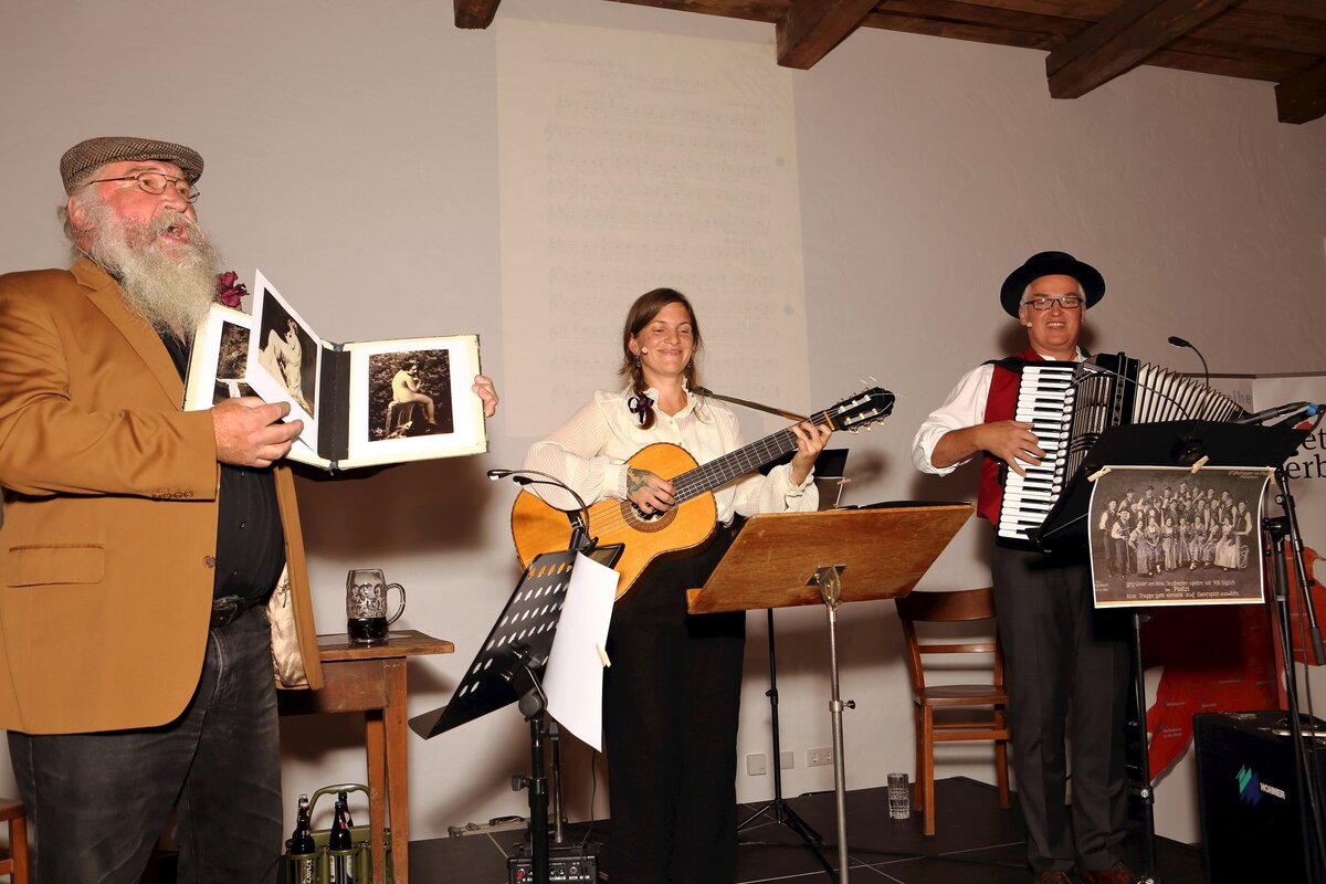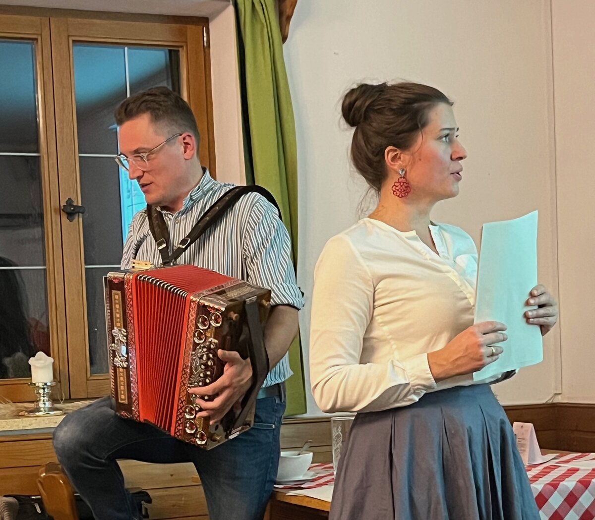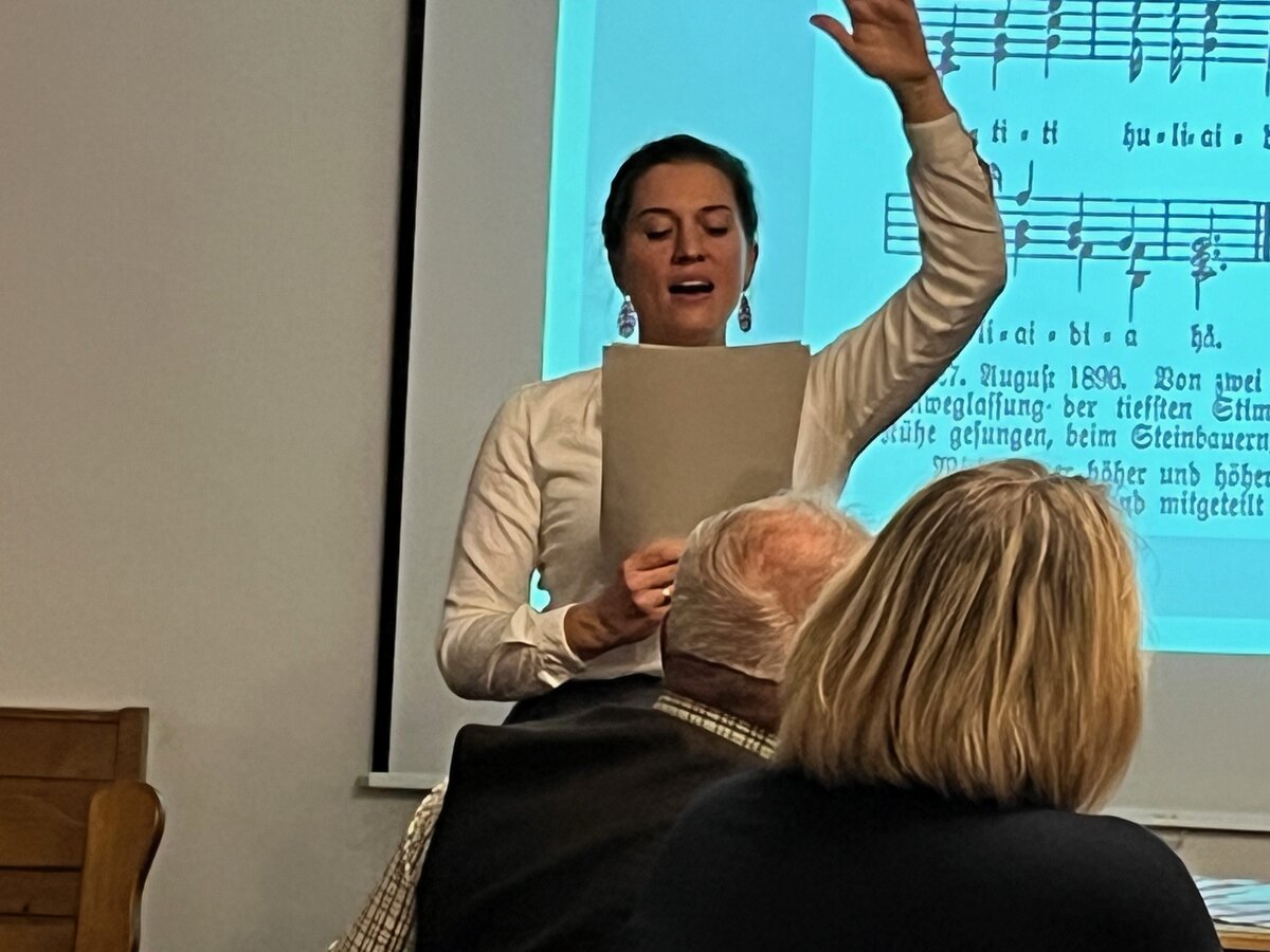 Leonhard Meixner und Antonia Kreppert vom Volksmusikarchiv des Bezirks Oberbayern führten in die Kunst des Jodelns ein. Die Besucher dieses Abends waren dazu eingeladen, ihre Jodelkünste zu erproben und mitzusingen. Die beiden Moderatoren begleiteten abwechselnd mit dem Akkordeon und leiteten das sangesfreudige Publikum zum mehrstimmigen Gesang an. Zahlreiche Videoausschnitte zeigten anschaulich die Variationsbreite des Jodlers von Oberbayern bis ins Allgäu oder auch in die Schweiz. Der Abend klang mit einem gemeinsamen Jodler aus, der ohne Liedblatt gesungen wurde - bestehen Jodler doch aus Lautfolgen, die meist leicht zu merken sind.