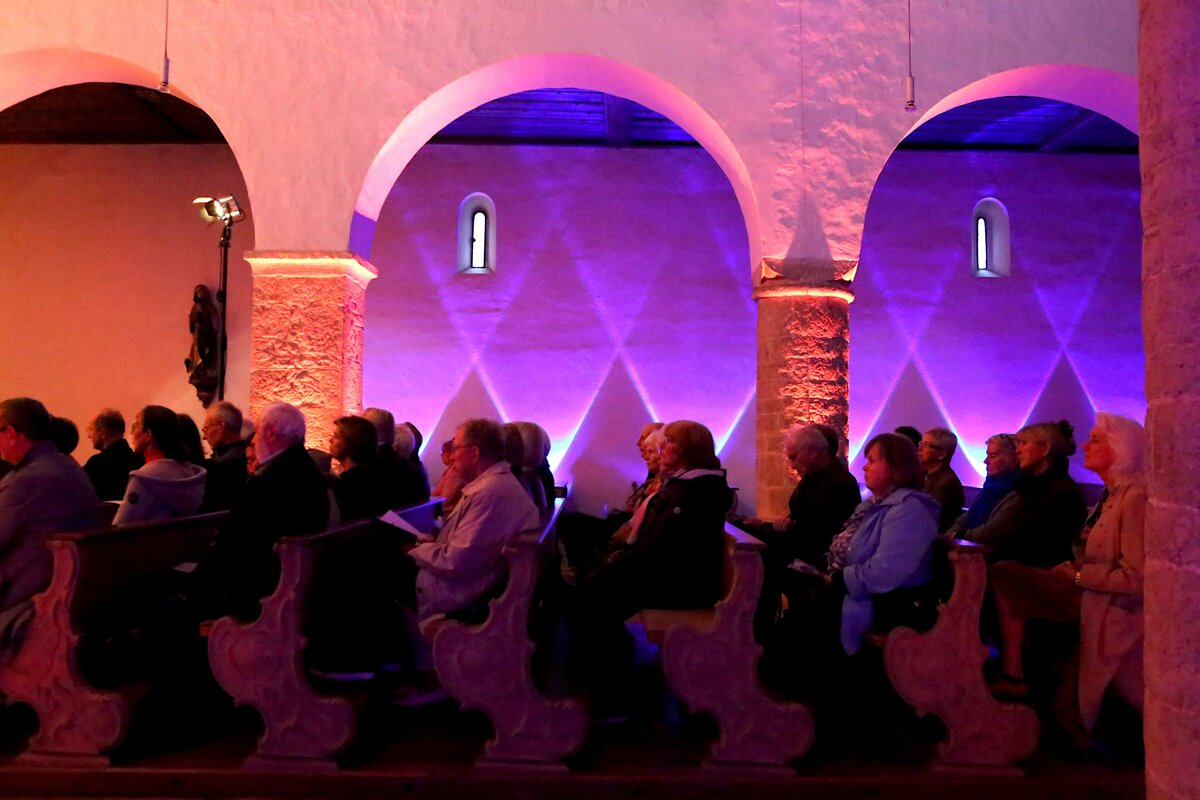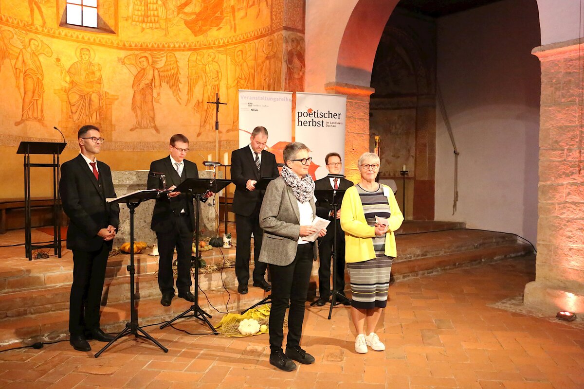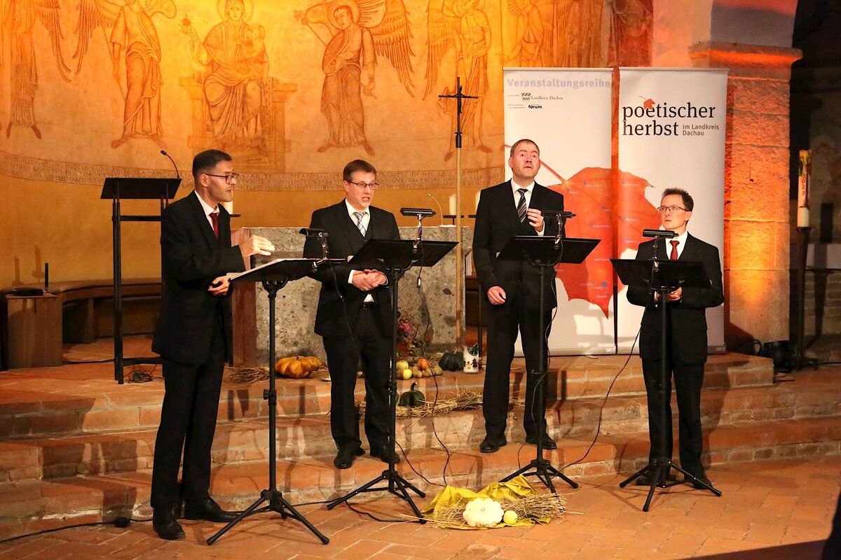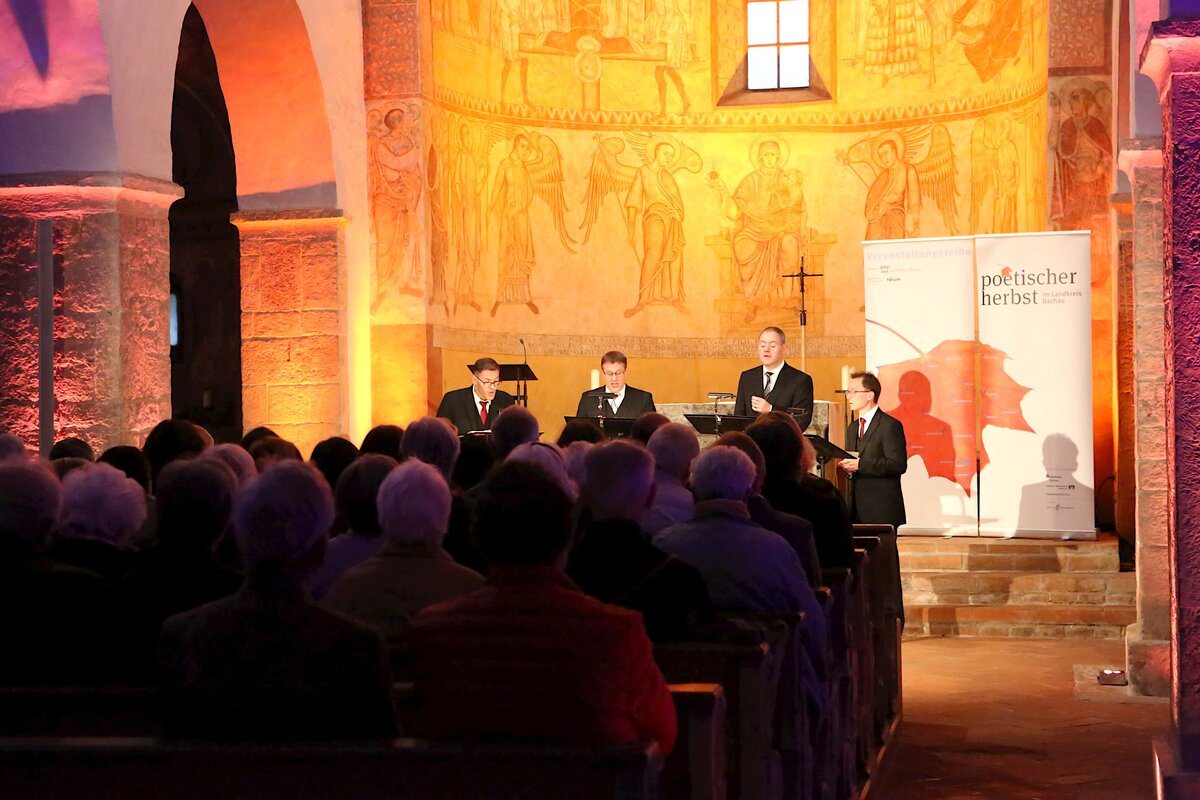 Das bekannte Vokalensemble „Quintenzirkel“ aus Augsburg bestritt den zweiten Abend des Poetischen Herbst. Constantin Wolff (Altus), Markus Plischke (Tenor), Dominik Wolff (Bariton) und Sebastian Fischer (Bass) singen seit 22 Jahren zusammen und ließen die Besucher:innen den perfekten Gleichklang ihrer Stimmen spüren. In der romanischen Basilika, die für diesen Anlass stimmungsvoll beleuchtet war, erklangen gregorianische Gesänge, Lieder der Barockzeit, der Romantik und auch moderne Kompositionen wie das „Ave Maria“ des 1956 geborenen Lorenz Maierhofer. Ein Abend, bei dem der harmonische Gesang den Kirchenraum füllte und sich gefühlt „Himmel und Erde durch die Musik begegneten“.