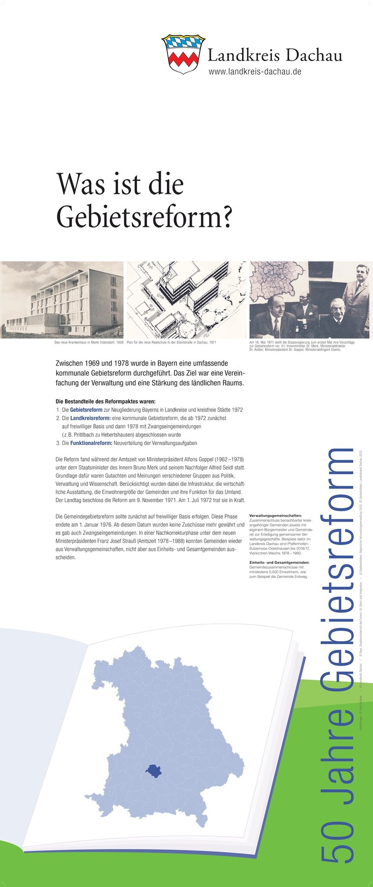 Genau ein Jahr vor der Gebietsreform des Jahres 1972 präsentierte das Bayerische Innenministerium in einer Broschüre den offiziellen Entwurf der Bayerischen Staatsregierung für die Neugliederung der Landkreise. In der Beschreibung des neu zu schaffenden Landkreises Dachau hieß es damals: